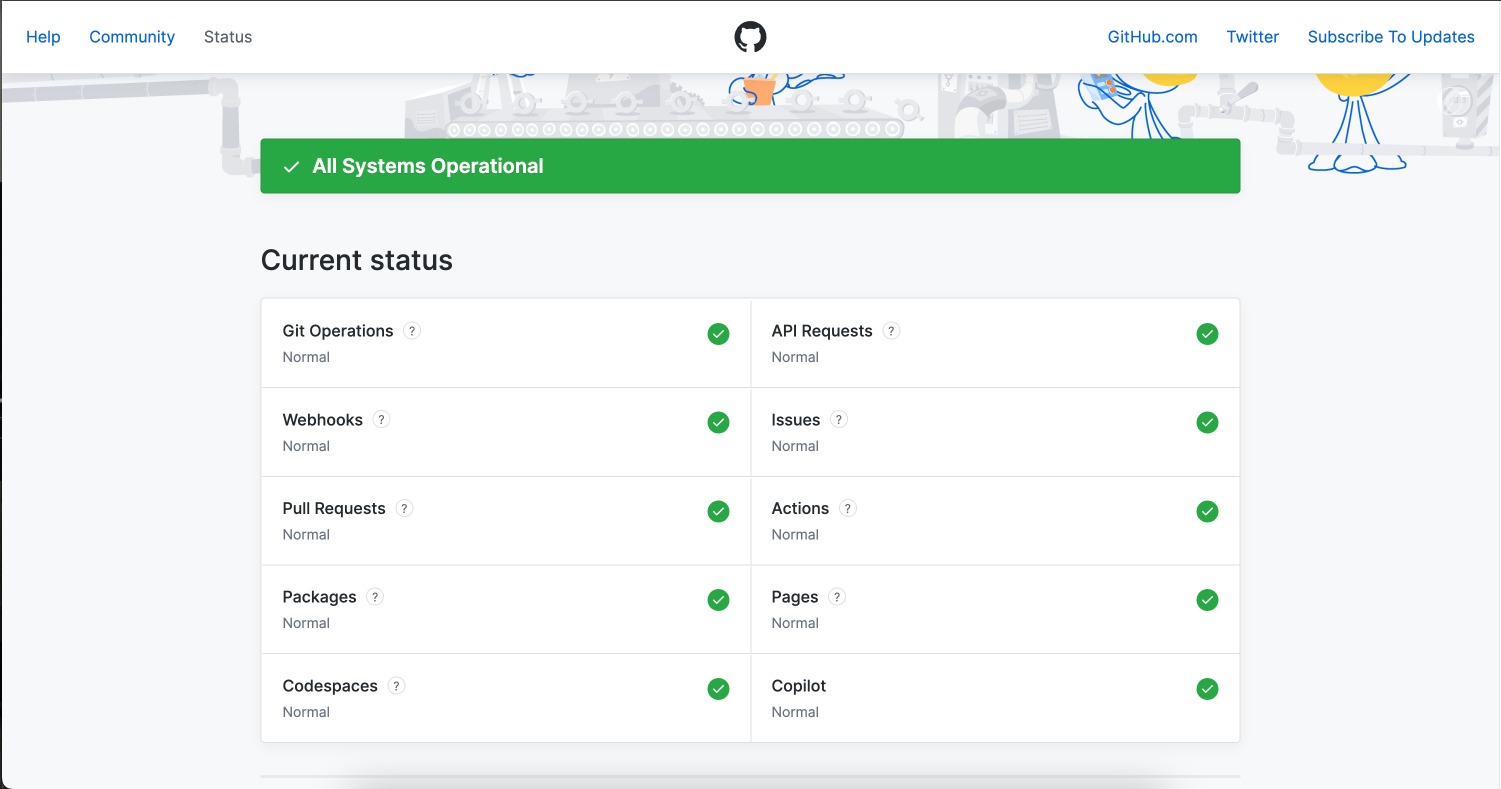 All Systems Operational Git Operations ? Operational API Requests ? Operational Webhooks ? Operational Visit www.githubstatus.com for more information Operational Issues ? Operational Pull Requests ? Operational Actions ? Operational Packages ? Operational