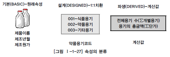 대개 코드성 속성은 원래 속성을 업무상 필요에 의해 변형하여 만든 설계 속성이고 일련번호와 같은 속성은 단일(Unique)한 식별자를 부여하기 위해 모델 상에서 새로 정의하는 설계속성이다. - 파생속성