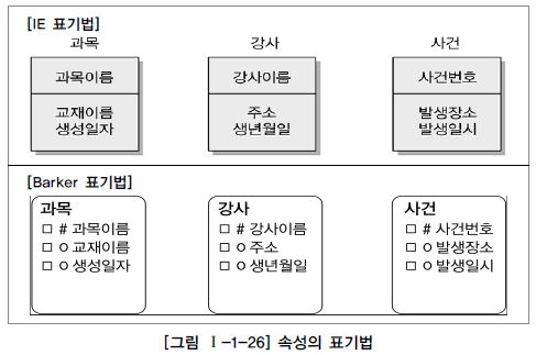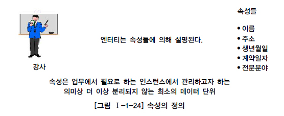 - 엔터티와 마찬가지로 반드시 해당 업무에서 필요하고 관리하고자 하는 정보이어야 한다.(ex) 강사의 교재이름)